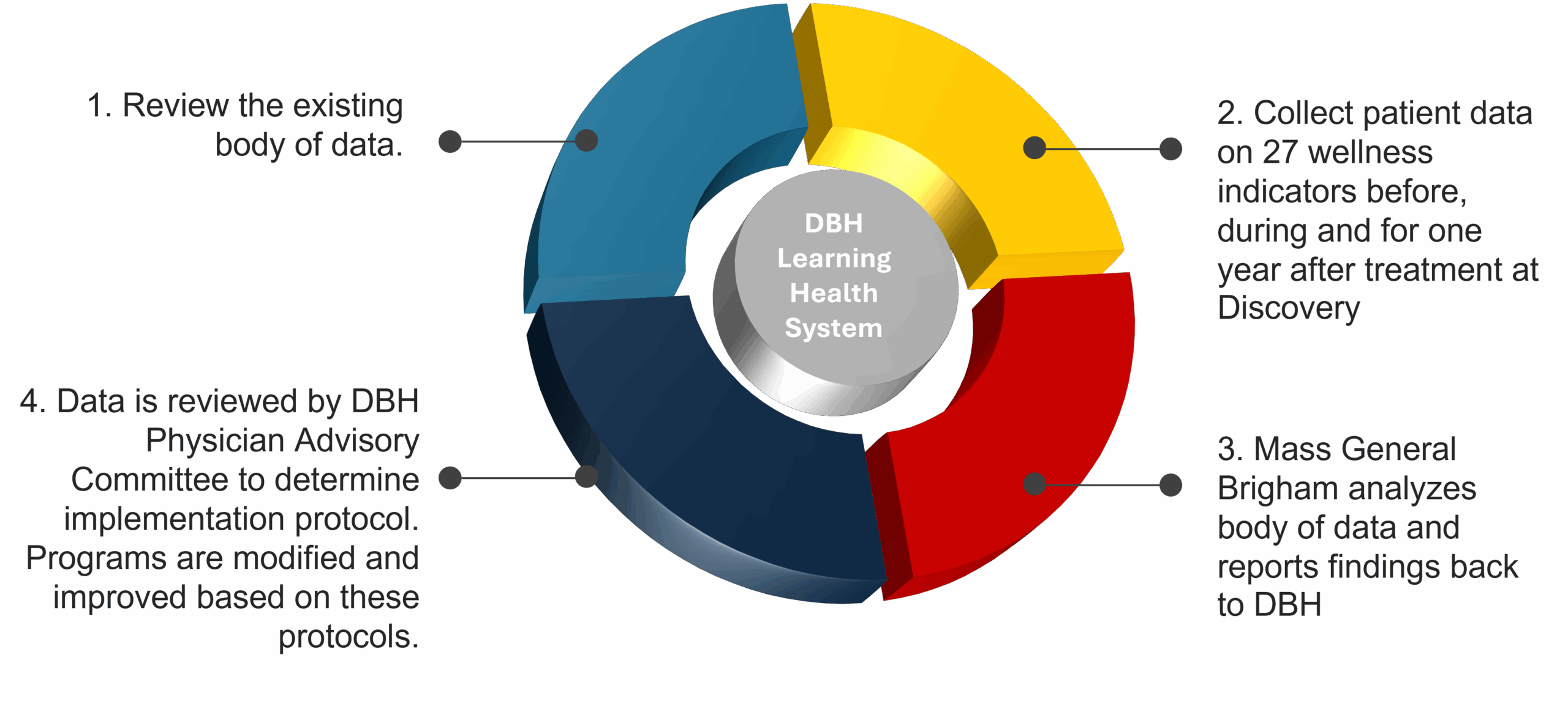 Data Collection. He began with what was possible: measuring care before and after treatment. Within two years, Discovery’s then Director of Alumni Relations, Rachel Wood, PhD, helped bring the vision closer to reality. Partnering with Videra Health, Wood helped develop a post-discharge platform powered by AI and machine learning. This innovation, called Discovery365, assessed and monitored patients for a full year after treatment—the “high-risk” stage when relapse was most likely—and alerted live support teams when patients showed signs of struggle. For the first time, recovery could extend beyond discharge, reduce and possibly prevent relapse. Longitudinal data began to accumulate.